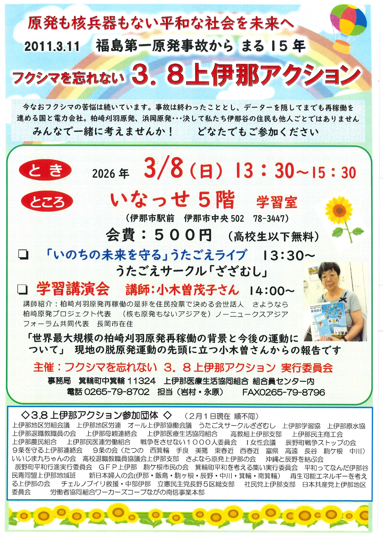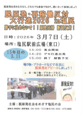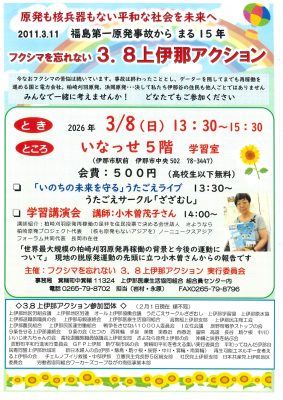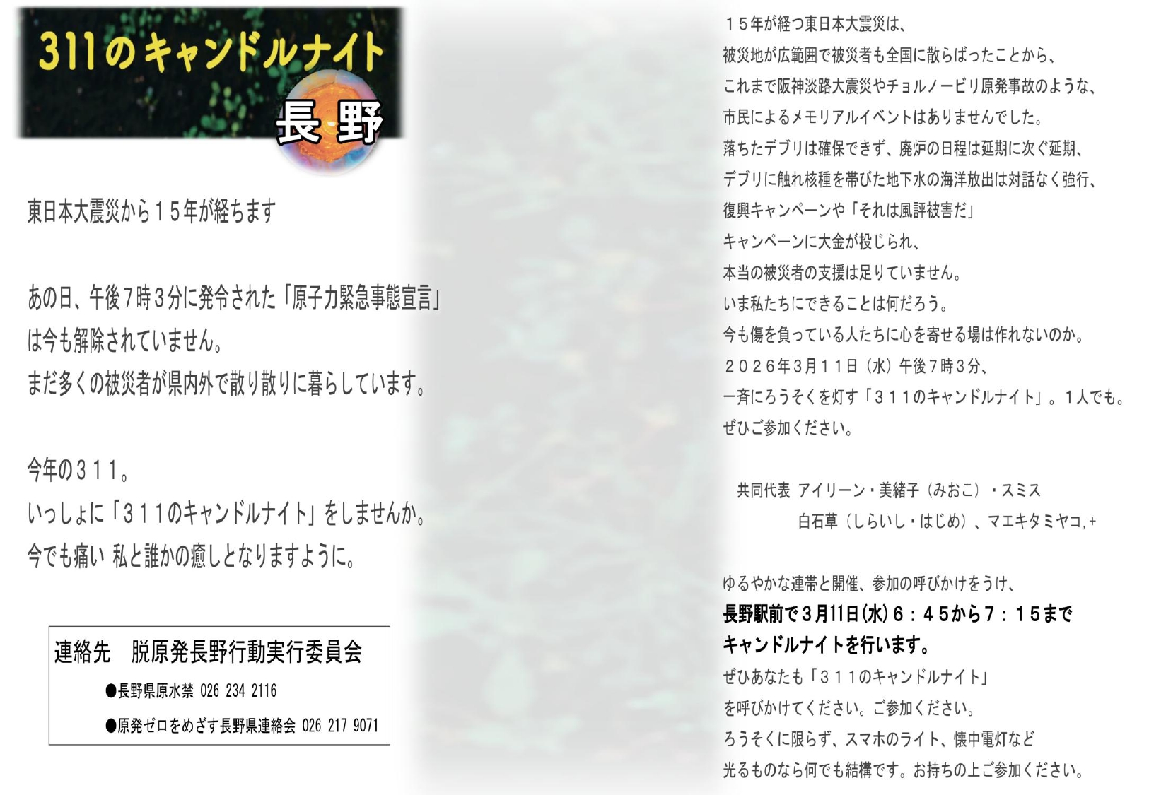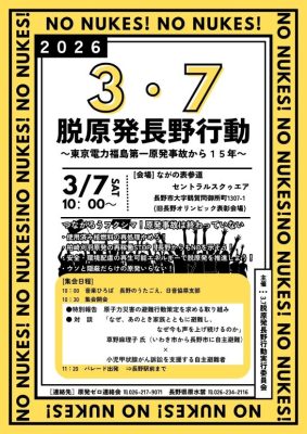~東京電力福島第一原発事故から15年~長野県内脱原発集会のお知らせ 2026年03月03日 お知らせ, コラム, 原発とエネルギー 3月 7日 長野市、塩尻市 3月 8日 松本市、伊那市 3月11日 長野駅前「311のキャンドルナイト」